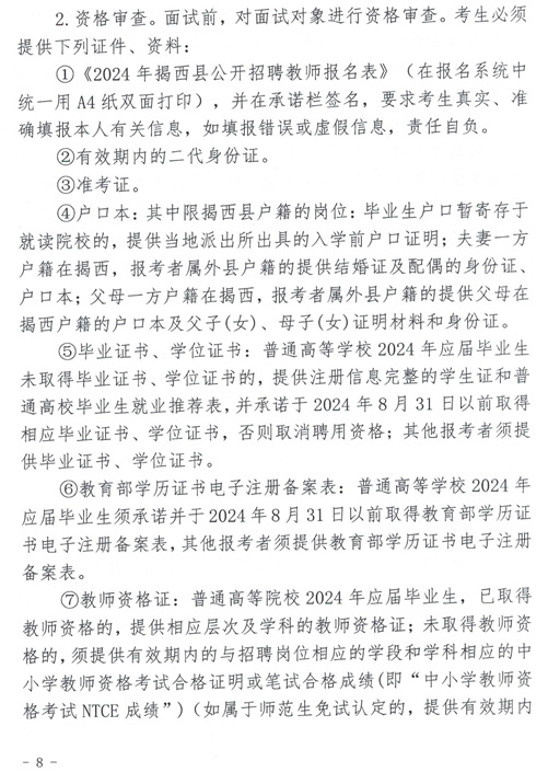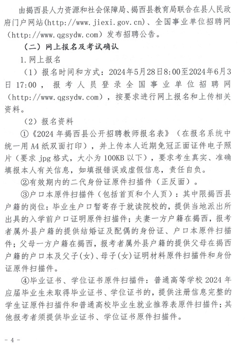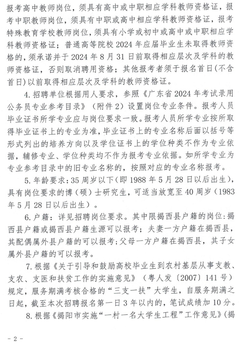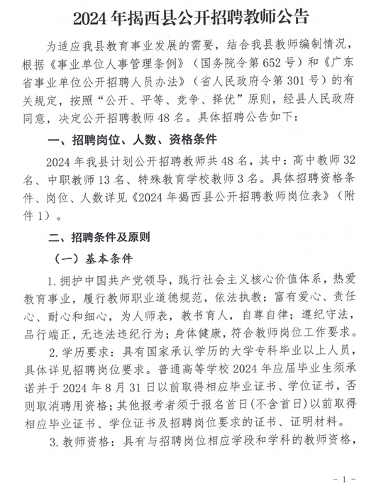 2024年我縣計(jì)劃公開招聘教師共48名,其中:高中教師32名、中職教師13名、特殊教育學(xué)校教師3名。具體招聘資格條件、崗位、人數(shù)詳見《2024年揭西縣公開招聘教師崗位表》(附件1)。