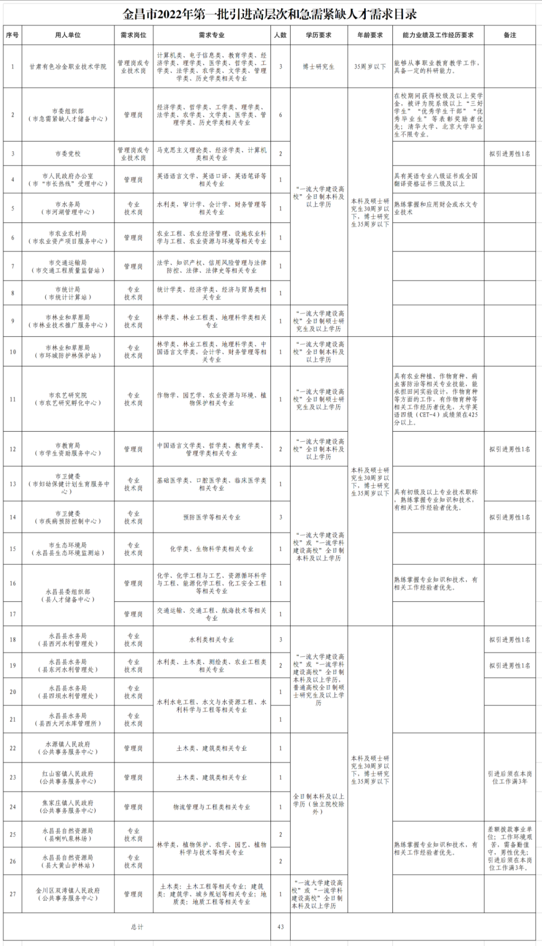 “一流大學(xué)建設(shè)高校”或“一流學(xué)科建設(shè)高校”全日制本科及以上學(xué)歷,且符合我市2022年高層次和急需緊缺人才專業(yè)需求條件的應(yīng)往屆畢業(yè)生(北京大學(xué)、清華大學(xué)畢業(yè)生及博士研究生可不受專業(yè)條件限制),共43名,其中市直26名,永昌縣16名,金川區(qū)1名(詳見《2022年金昌市第一批引進(jìn)高層次和急需緊缺人才需求目錄》)。對基層邊遠(yuǎn)地區(qū)和個(gè)別特殊緊缺的崗位適當(dāng)放寬畢業(yè)院校條件,各崗位招聘條件和要求以需求目錄為準(zhǔn)。
