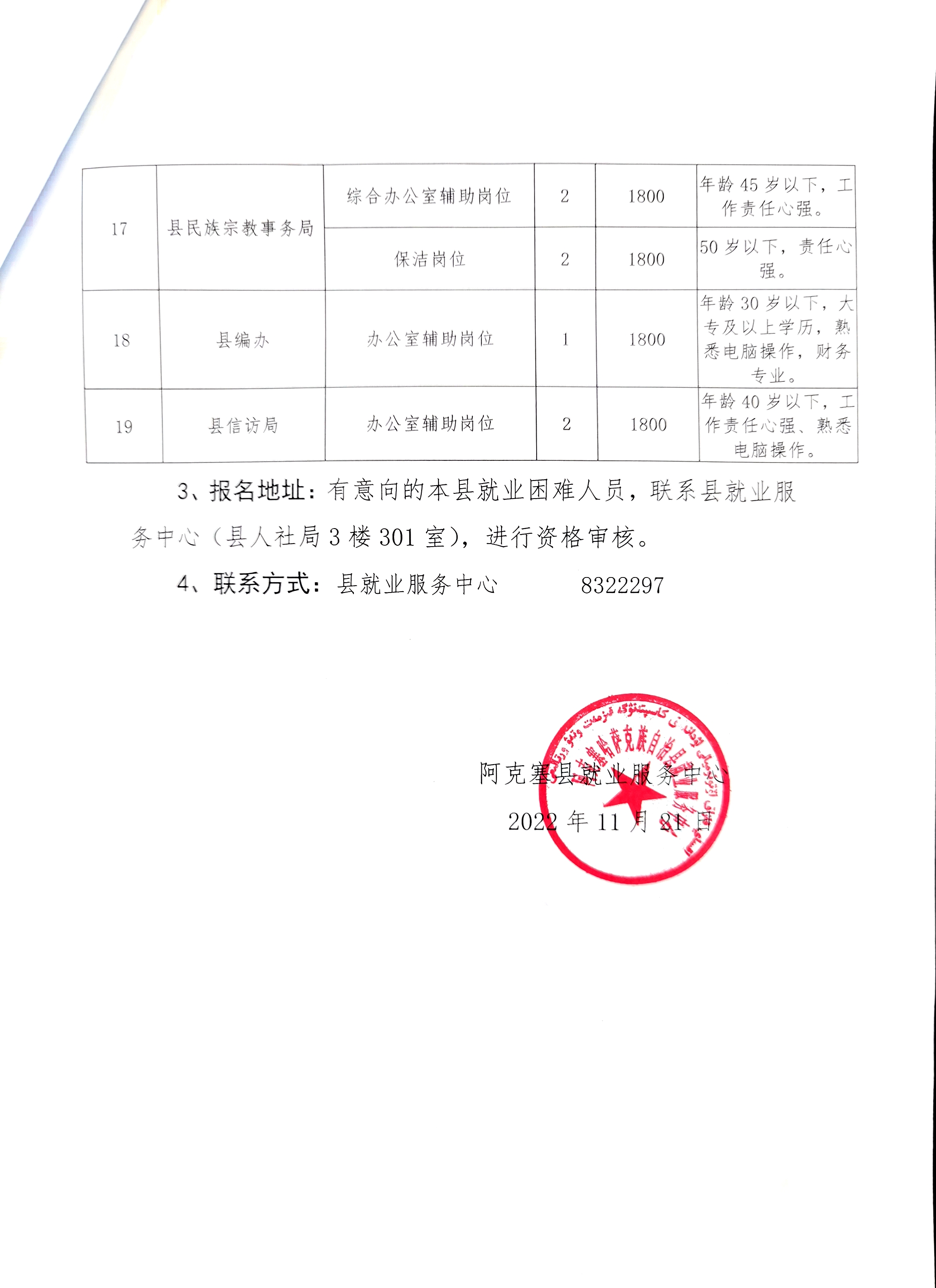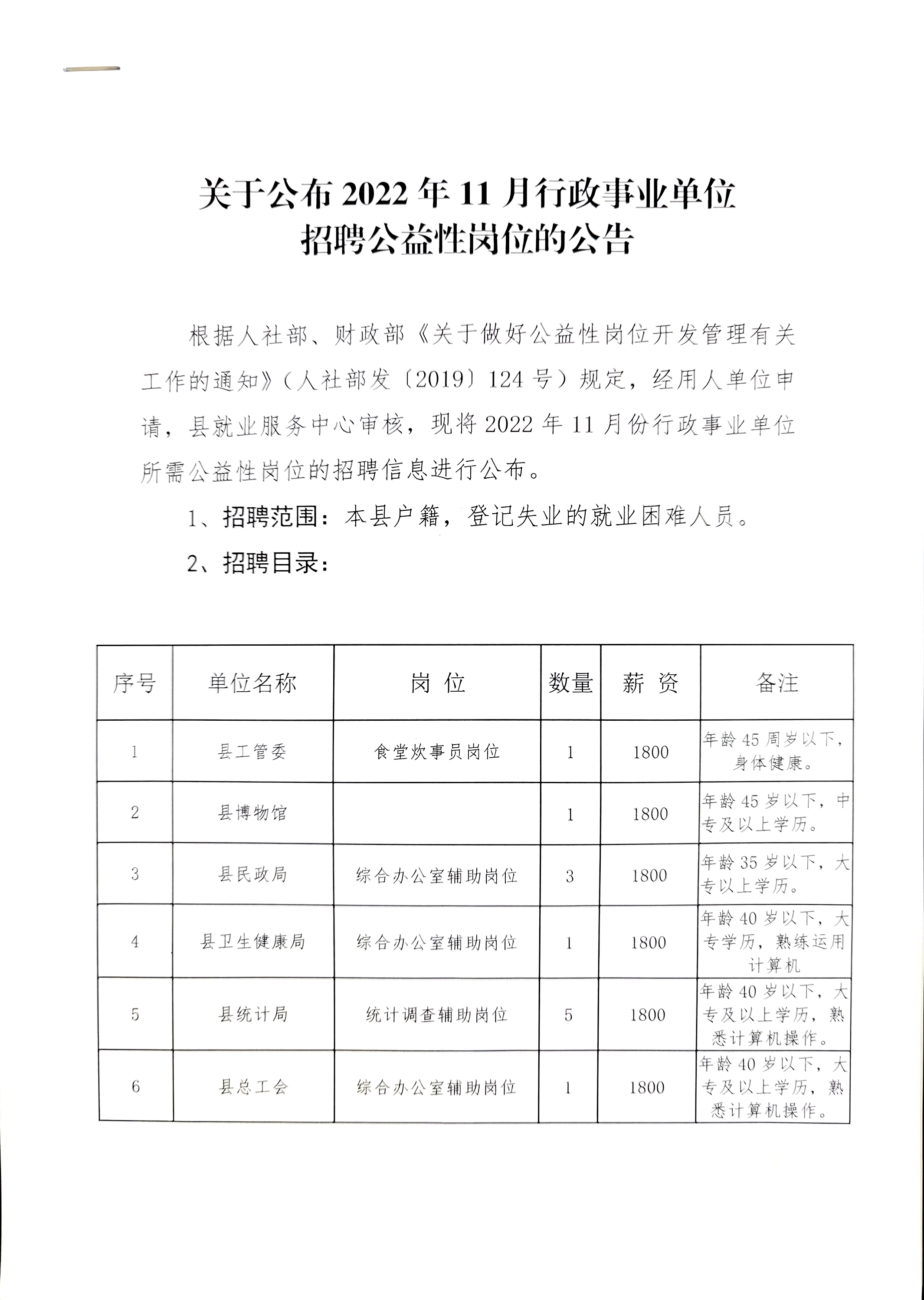 2022-11-23 10:54:20閱讀()酒泉市阿克塞人民政府根據(jù)人社部、財(cái)政部《關(guān)于做好公益性崗位開發(fā)管理有關(guān)工作的通知》(人社部發(fā)〔2019〕124號(hào))規(guī)定,經(jīng)用人單位申請(qǐng),縣就業(yè)服務(wù)中心審核,現(xiàn)將2022年11月份行政事業(yè)單位所需公益性崗位的招聘信息進(jìn)行公布。