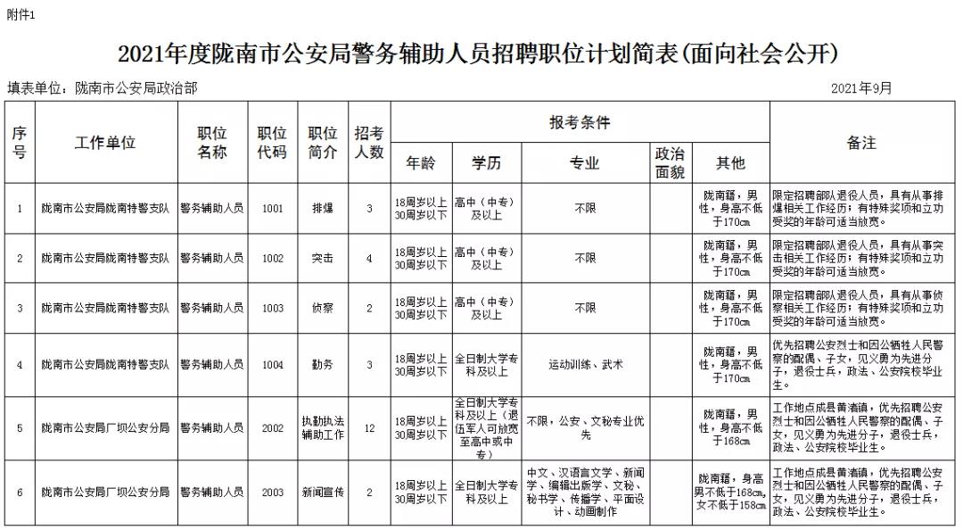 1、2021年度隴南市公安局警務(wù)輔助人員招聘職位計(jì)劃簡(jiǎn)表(面向社會(huì)公開(kāi))