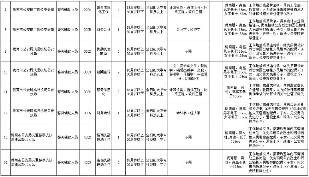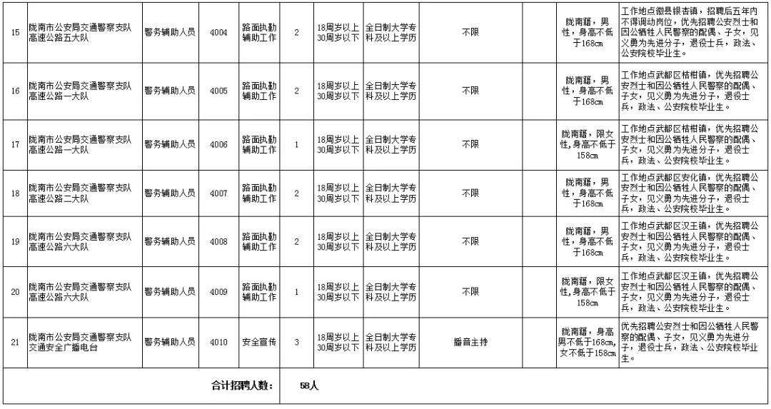 (一)隴南市公安局面向社會(huì)公開(kāi)招聘警務(wù)輔助人員共58名,具體崗位如下:
