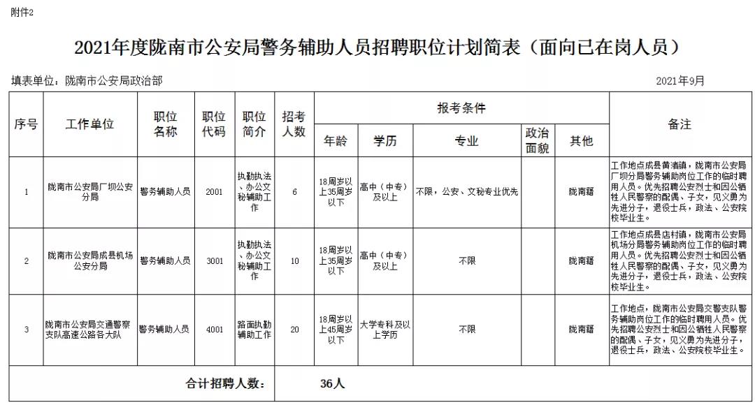 (二)隴南市公安局招聘警務(wù)輔助人員36名(面向已在隴南市公安局廠壩公安分局、機(jī)場(chǎng)分局、交警支隊(duì)警務(wù)輔助崗位工作的臨時(shí)聘用人員),具體崗位如下: