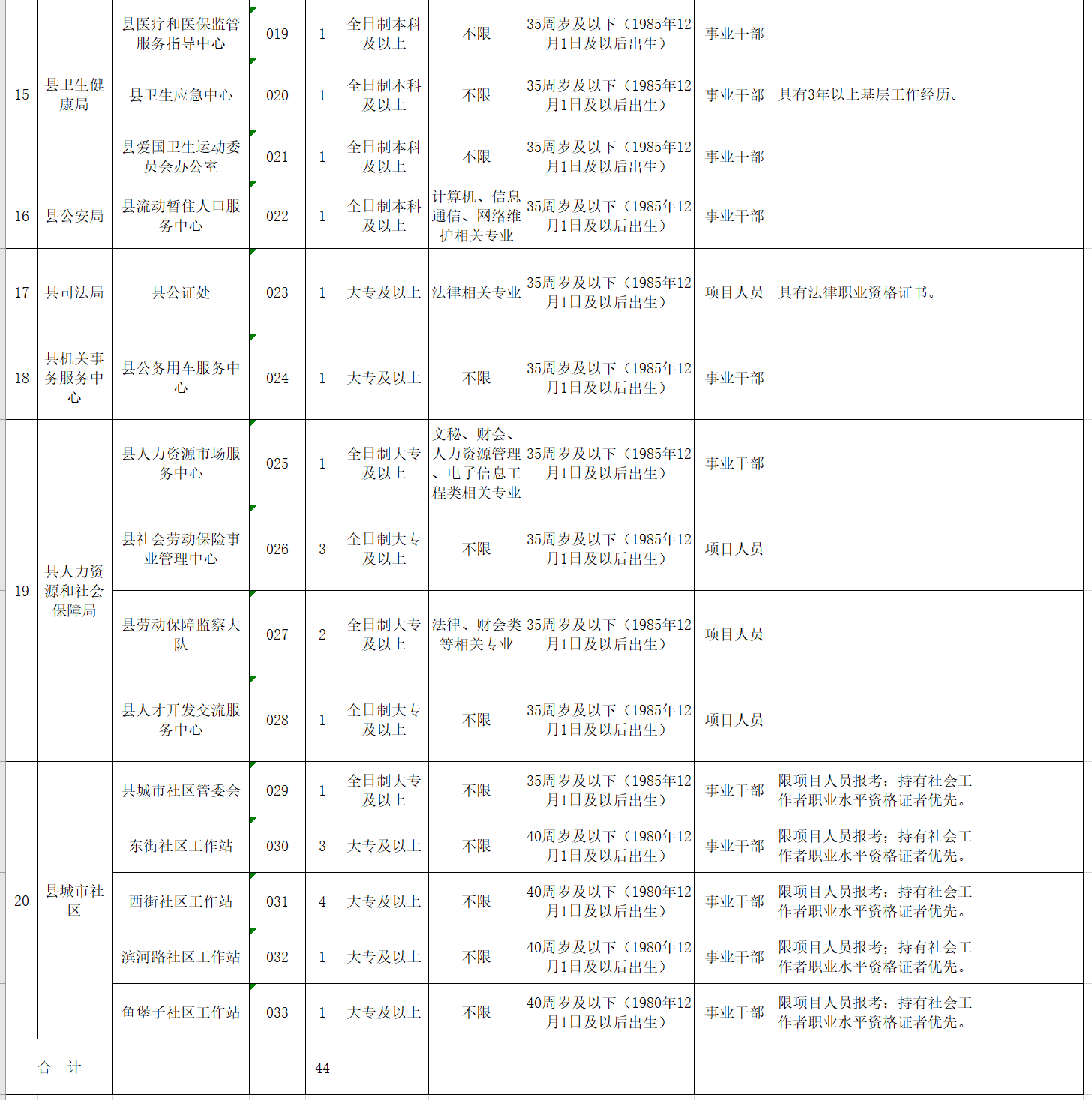 計劃為縣政府決策咨詢服務中心等33個事業(yè)單位公開選調工作人員44人(詳見附件1)。其中事業(yè)干部31人,項目人員13人。