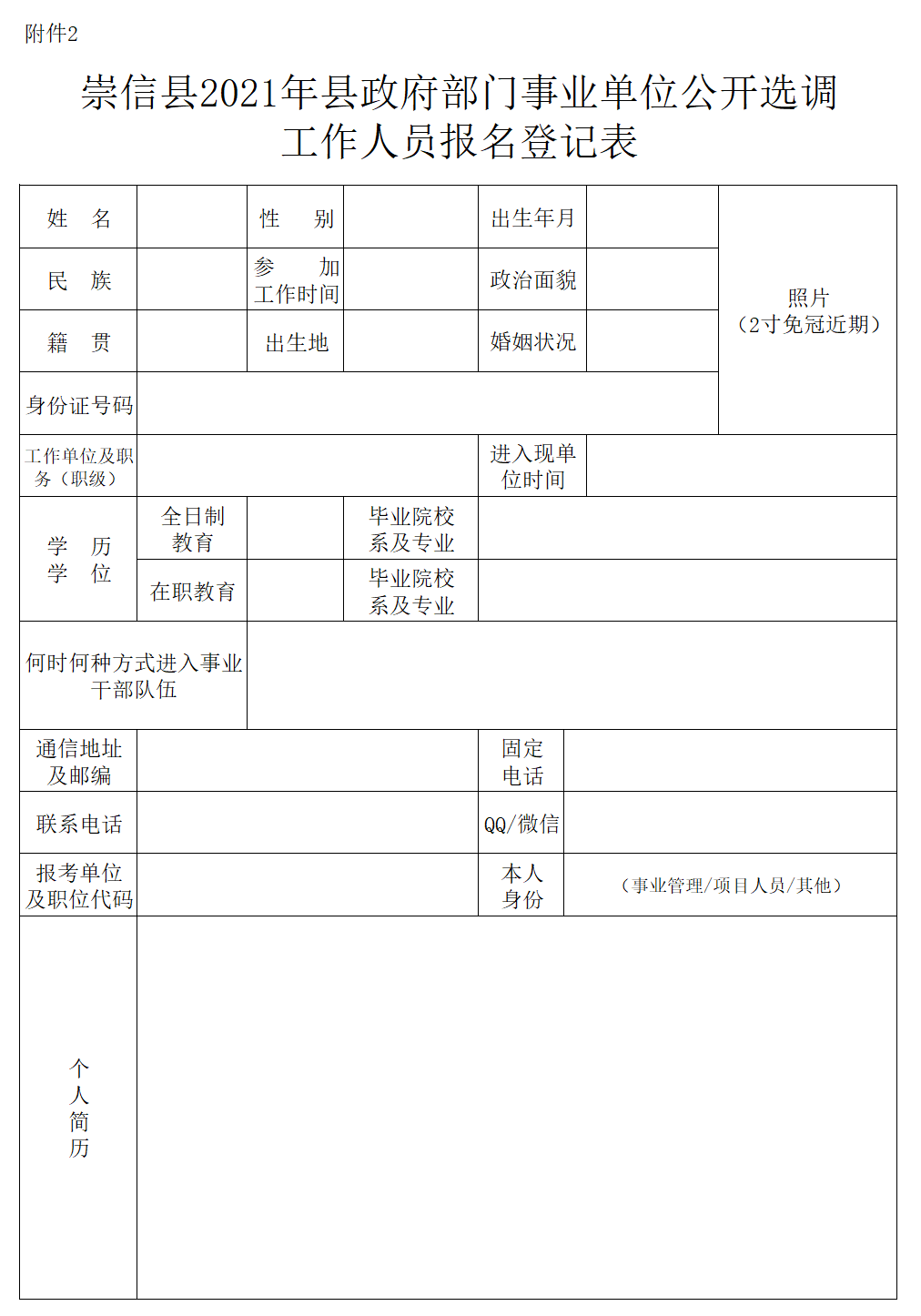 (2)填寫《崇信縣2021年縣政府部門事業(yè)單位公開選調工作人員報名登記表》(附件2)。