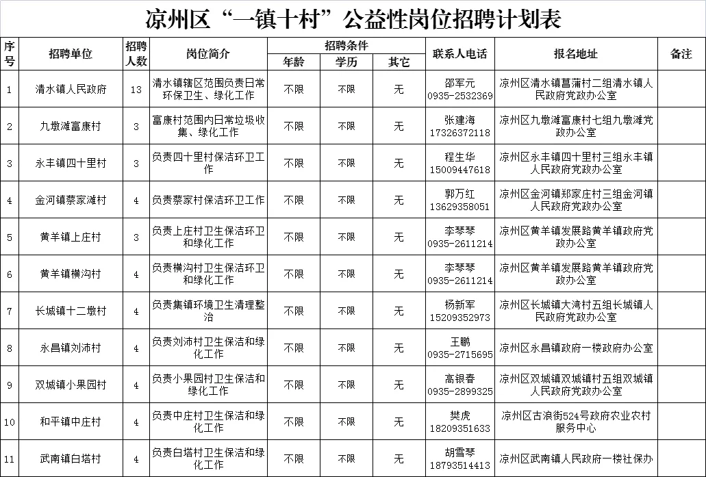 詳見《涼州區(qū)“一鎮(zhèn)十村”公益性崗位招聘計(jì)劃表》。