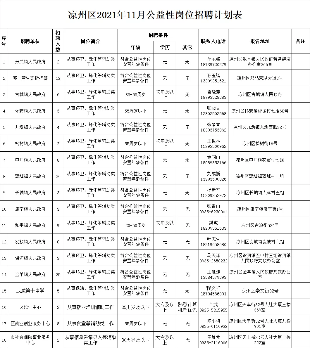 2.報名地點(diǎn):詳見《涼州區(qū)2021年11月公益性崗位招聘計劃表》;