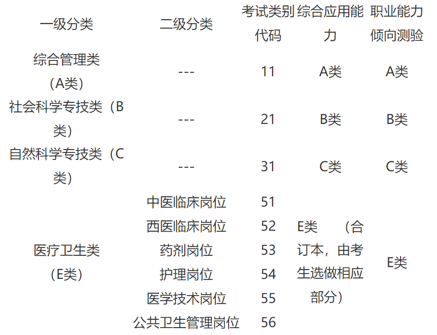筆試科目為《綜合應(yīng)用能力》和《職業(yè)能力傾向測(cè)驗(yàn)》兩科,每科分值為150分。按分類進(jìn)行考試,不同類別的考試使用不同的試題??荚囶悇e分為綜合管理類(A類)、社會(huì)科學(xué)專技類(B類)、自然科學(xué)專技類(C類)和醫(yī)療衛(wèi)生類(E類)四類。