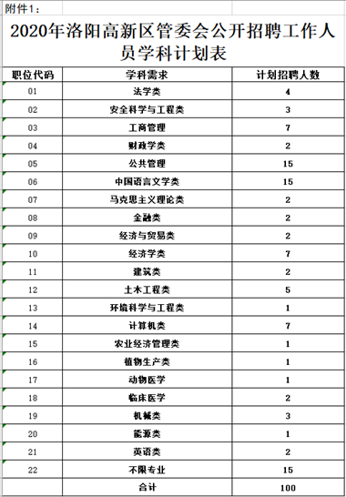 計(jì)劃公開招聘100人,涉及學(xué)科類別21個(gè),另設(shè)一個(gè)不限學(xué)科門類,各學(xué)科的招聘數(shù)量詳見《2020年洛陽高新區(qū)管委會(huì)公開招聘工作人員學(xué)科計(jì)劃表》(附件1),各學(xué)科類別的具體專業(yè)要求詳見《2020年洛陽高新區(qū)管委會(huì)公開招聘工作人員考試學(xué)科分類專業(yè)對照表》(附件2)。