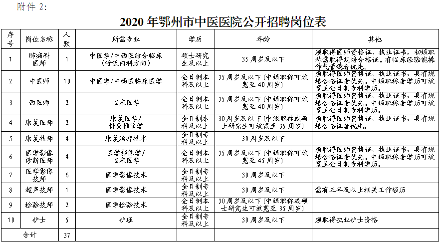 學(xué)歷、專業(yè)、年齡、職稱、工作經(jīng)歷及其他條件詳見(jiàn)附件2《2020年鄂州市中醫(yī)醫(yī)院公開(kāi)招聘崗位表》。