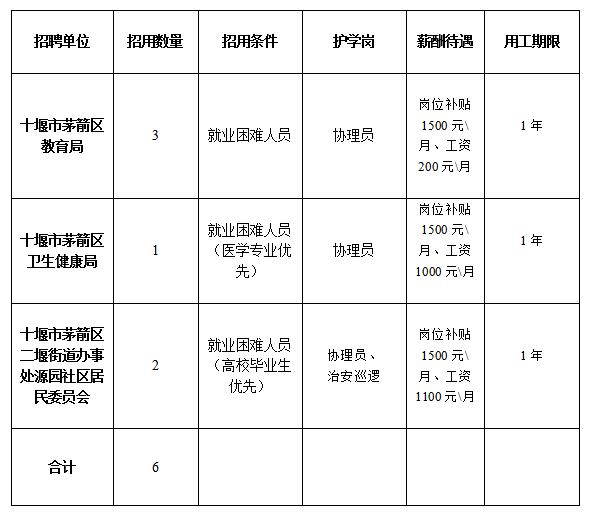 招聘公益性崗位工作人員共6名,從事協(xié)理員、護學崗等相關(guān)工作。