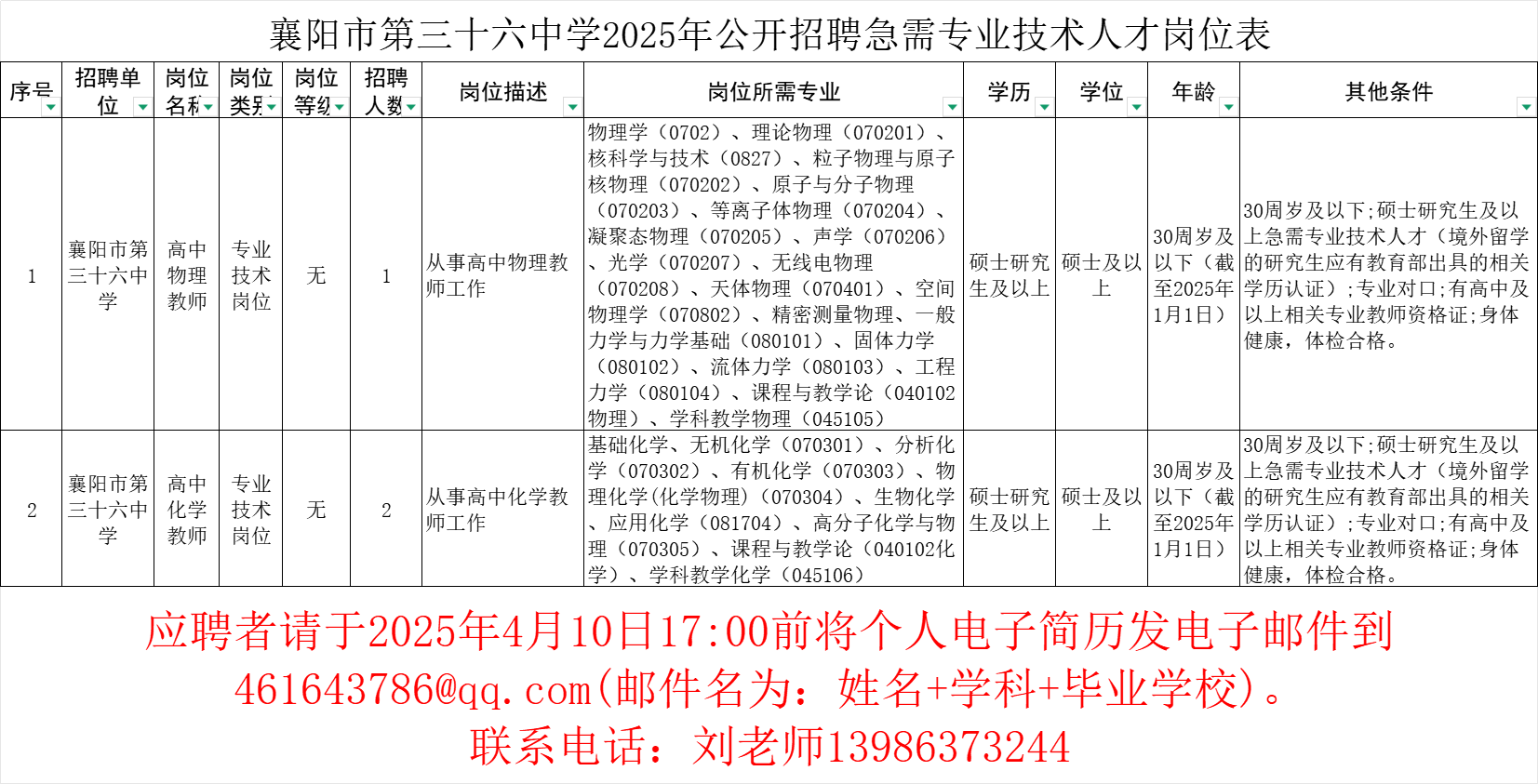 詳見(jiàn)《襄陽(yáng)市第三十六中學(xué)2025年公開(kāi)招聘急需專業(yè)技術(shù)人才崗位表》。