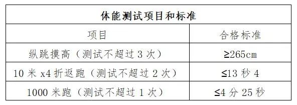 體能測評時間以通知為準。體能測評項目為縱跳摸高、10米×4往返跑,1000米跑順序進行。三項測試其中兩項通過者視為合格,發(fā)放筆試準考證。