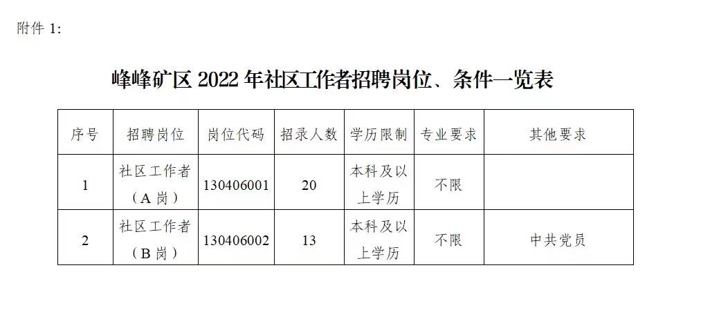 本次計(jì)劃公開招聘社區(qū)工作者33名。工作崗位及崗位人數(shù)詳見附表《峰峰礦區(qū)2022年社區(qū)工作者招聘崗位、條件一覽表》。
