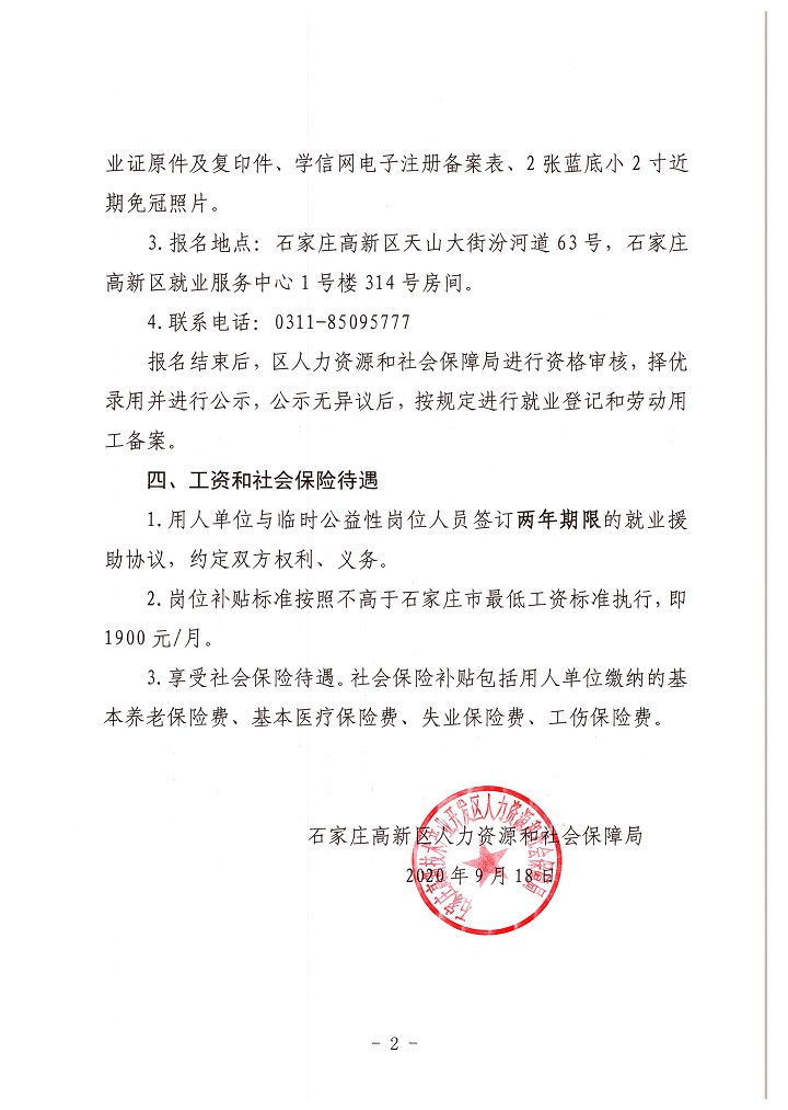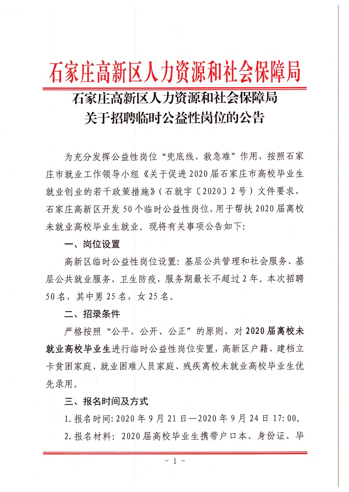 2020年石家莊高新區(qū)人力資源和社會保障局招聘臨時公益性崗位公告