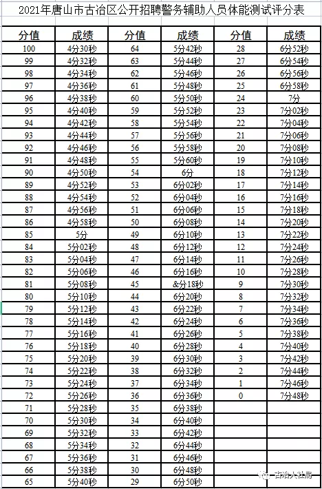 附件:1、2021年唐山市古冶區(qū)公開招聘警務(wù)輔助人員體能測試評分表