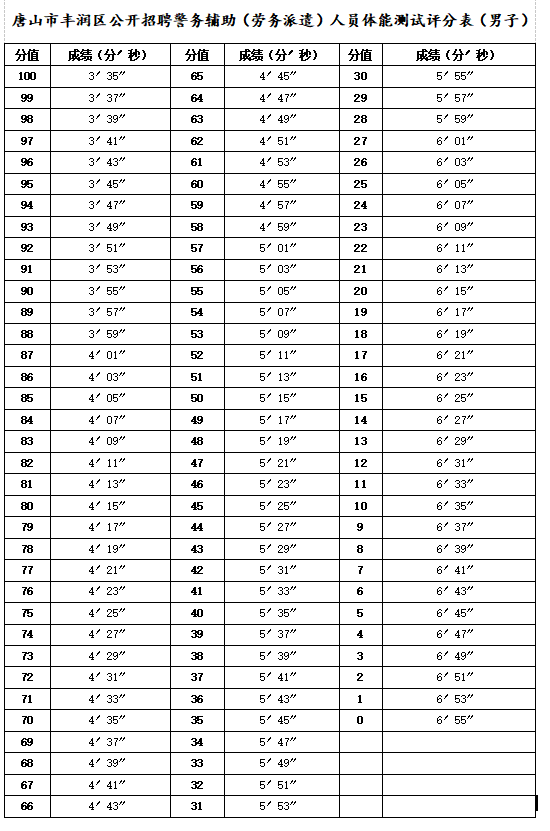 (3)測(cè)試成績(jī)。參考《公安機(jī)關(guān)錄用人民警察體能測(cè)評(píng)項(xiàng)目和標(biāo)準(zhǔn)》制定《唐山市豐潤(rùn)區(qū)公開招聘警務(wù)輔助(勞務(wù)派遣)人員體能測(cè)評(píng)評(píng)分表》(見附件),總分100分,根據(jù)體能測(cè)評(píng)所用時(shí)間確定排名順序。未跑完全程不計(jì)成績(jī)。體能測(cè)評(píng)成績(jī)0分的為不合格成績(jī),不進(jìn)入下一環(huán)節(jié)。體能測(cè)評(píng)成績(jī)通過(guò)“豐潤(rùn)人才發(fā)展集團(tuán)公開招聘 (http://gkks.frrcjt.com/)”發(fā)布。