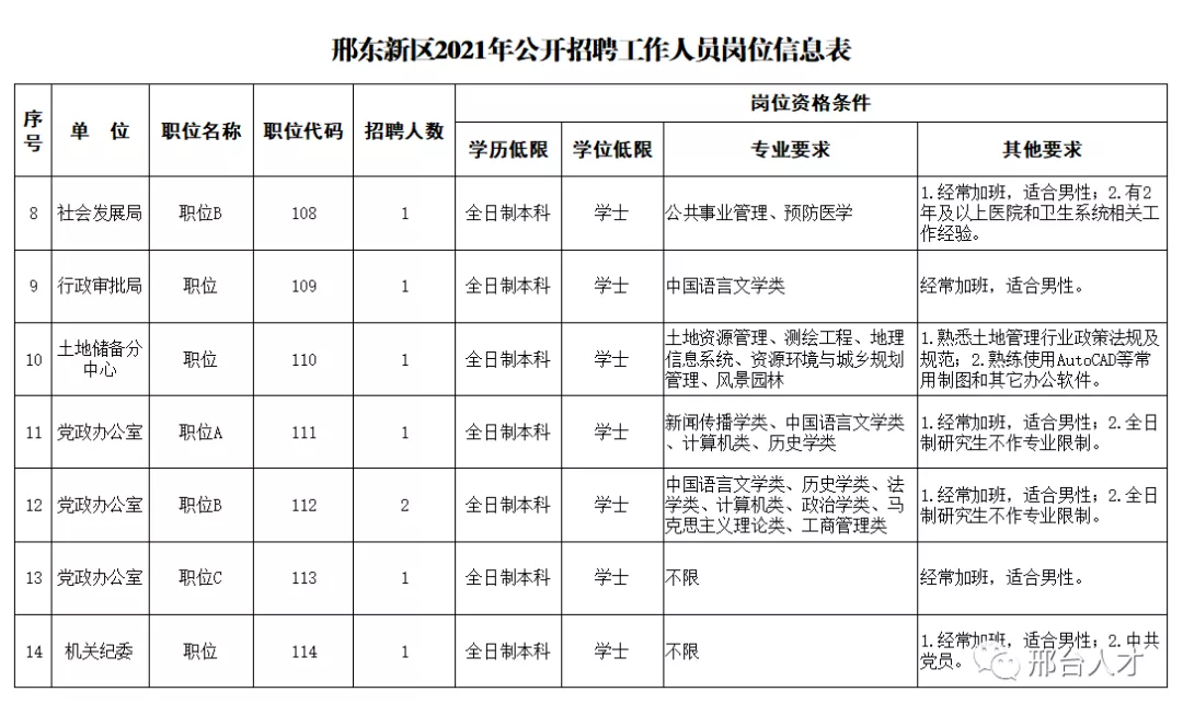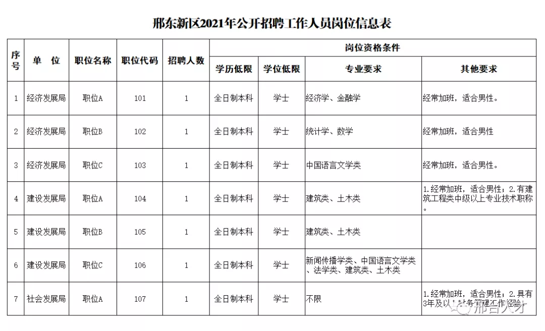 1.招聘崗位所需的具體條件詳見《邢東新區(qū)2021年公開招聘工作人員崗位信息表》。