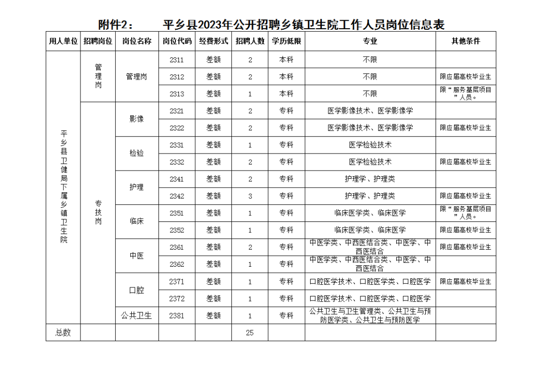 公開(kāi)招聘鄉(xiāng)鎮(zhèn)衛(wèi)生院工作人員25名。其中:管理崗5名,專技崗20名。詳見(jiàn)《平鄉(xiāng)縣2023年公開(kāi)招聘鄉(xiāng)鎮(zhèn)衛(wèi)生院工作人員崗位計(jì)劃表》(附件1),《平鄉(xiāng)縣2023年公開(kāi)招聘鄉(xiāng)鎮(zhèn)衛(wèi)生院工作人員崗位信息表》(附件2)。