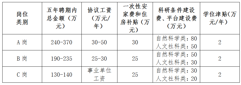 按照學校有關文件精神,與學校簽訂人才引進協議,兌現人才待遇。其中,博士可申報A、B、C三類崗位,相關待遇如下: