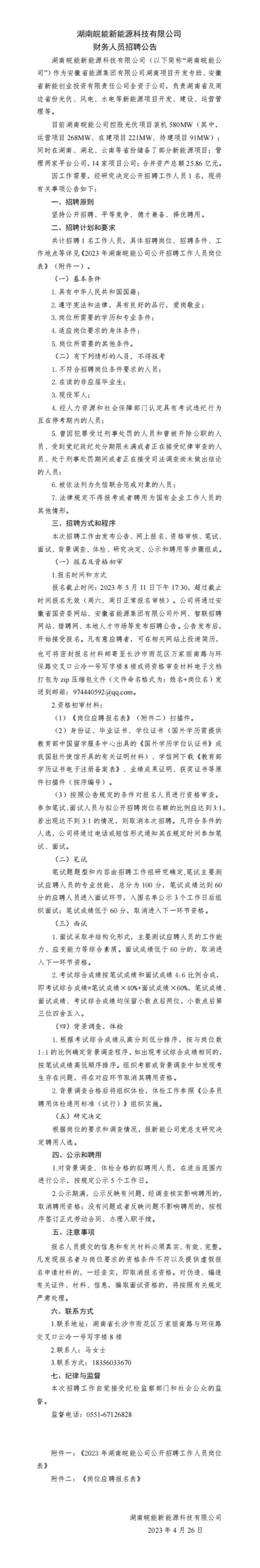 共計招聘1名工作人貝;大沖N在切迪工作人員崗位作地點等詳見《2023年湖南皖能公司公開招聘工作人員崗位表》(附件一)。