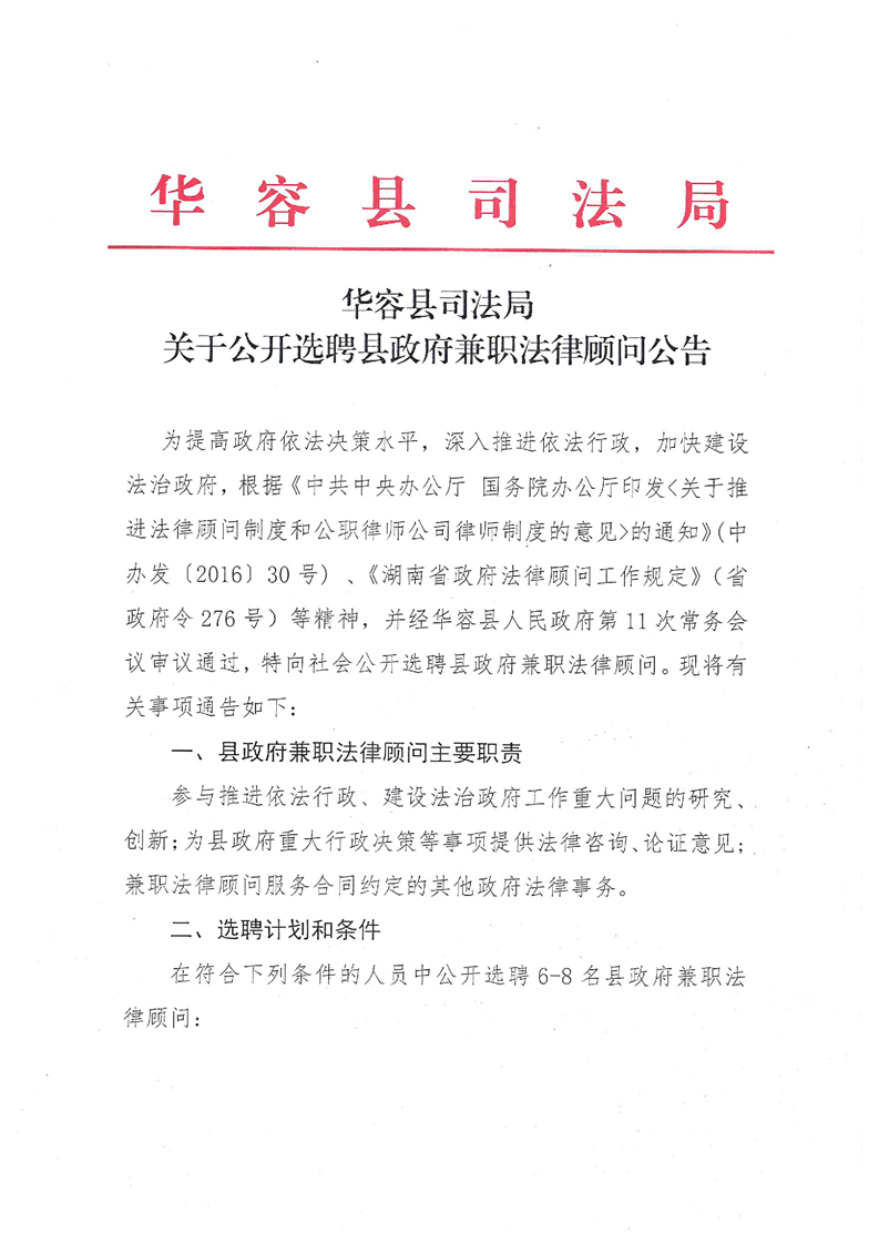 為提高政府依法決策水平,深入推進(jìn)依法行政,加快建設(shè)法治政府,根據(jù)《中共中央辦公廳國務(wù)院辦公廳印發(fā)<關(guān)于推進(jìn)法律顧問制度和公職律師公司律師制度的意見>的通知》(中辦發(fā)〔2016〕30 號)、《湖南省政府法律顧問工作規(guī)定》(省政府令276號)等精神,并經(jīng)華容縣人民政府第11次常務(wù)會議審議通過,特向社會公開選聘縣政府兼職法律顧問?,F(xiàn)將有關(guān)事項通告如下: