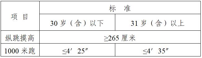 2.體能測(cè)評(píng)項(xiàng)目及標(biāo)準(zhǔn)。本次招聘體能測(cè)評(píng)共兩項(xiàng):縱跳摸高、1000米跑。體能測(cè)評(píng)參照《公安機(jī)關(guān)錄用人民警察體能測(cè)評(píng)項(xiàng)目和標(biāo)準(zhǔn)(暫行)》執(zhí)行。