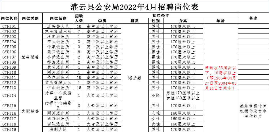 本次所招聘的警務(wù)輔助人員,是指為公安機(jī)關(guān)日常運(yùn)轉(zhuǎn)和警務(wù)活動(dòng)提供輔助支持的非人民警察身份且非事業(yè)編制身份人員。具體崗位及招聘條件等詳見《灌云縣公安局2022年4月招聘崗位表》,可在灌云縣人民政府網(wǎng)(http://www.guanyun.gov.cn/gyxzf/gsgg/gsgg.html)公示公告欄查詢。