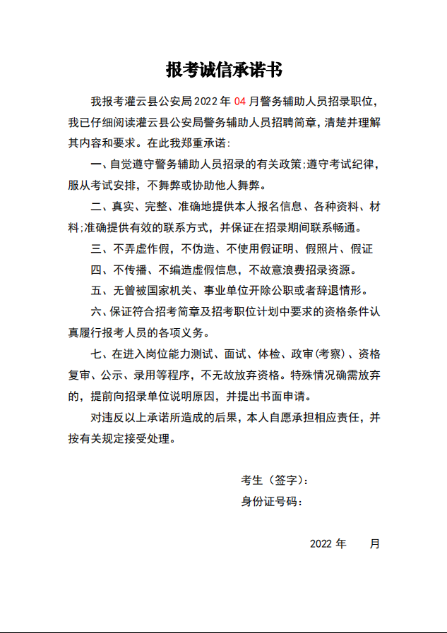 (9)連云港市公安機(jī)關(guān)在職輔警、工勤人員需攜帶單位同意報(bào)考證明。曾因違反公安機(jī)關(guān)警務(wù)輔助人員、工勤人員管理規(guī)定解除勞動(dòng)合同的人員,不得報(bào)考。