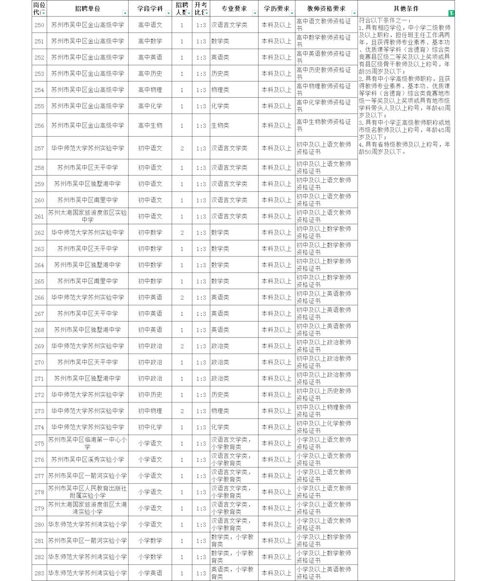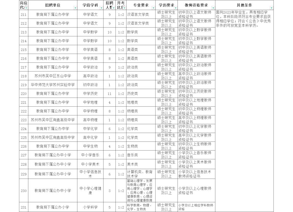 (四)具備《2023年蘇州市吳中區(qū)教育局公開招聘中小學(xué)教師崗位簡介表》(見附件)中要求的資格條件,崗位簡介表中對招聘崗位基本條件和其他資格條件另有規(guī)定的從其規(guī)定,工作經(jīng)歷計算的截止時間為2023年8月31日。