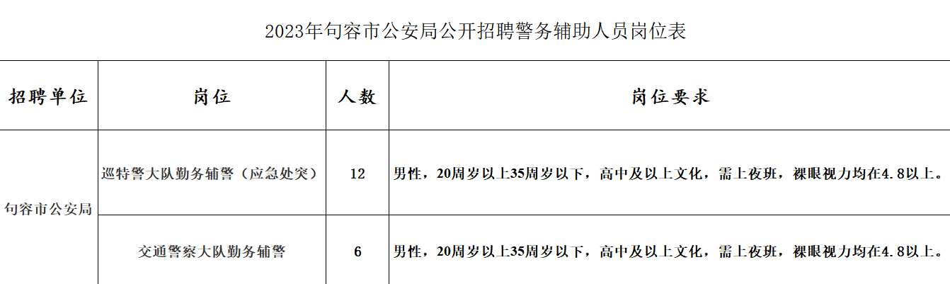 5.招聘崗位、人數(shù)和所要求的年齡、性別、學(xué)歷、身體條件等資格條件詳見(jiàn)《2023年句容市公安局公開招聘警務(wù)輔助人員崗位表》(附件1)。