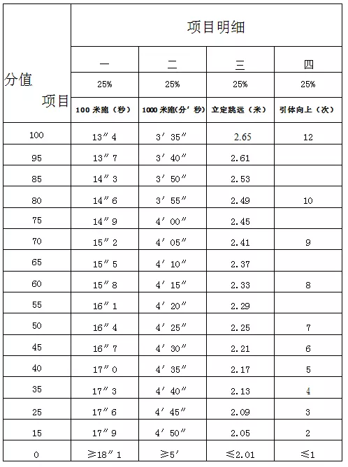 (3)測試項目:1000米跑、100米跑、立定跳遠、引體向上各占25分的權(quán)重分值(評分標(biāo)準(zhǔn)見附件二)。