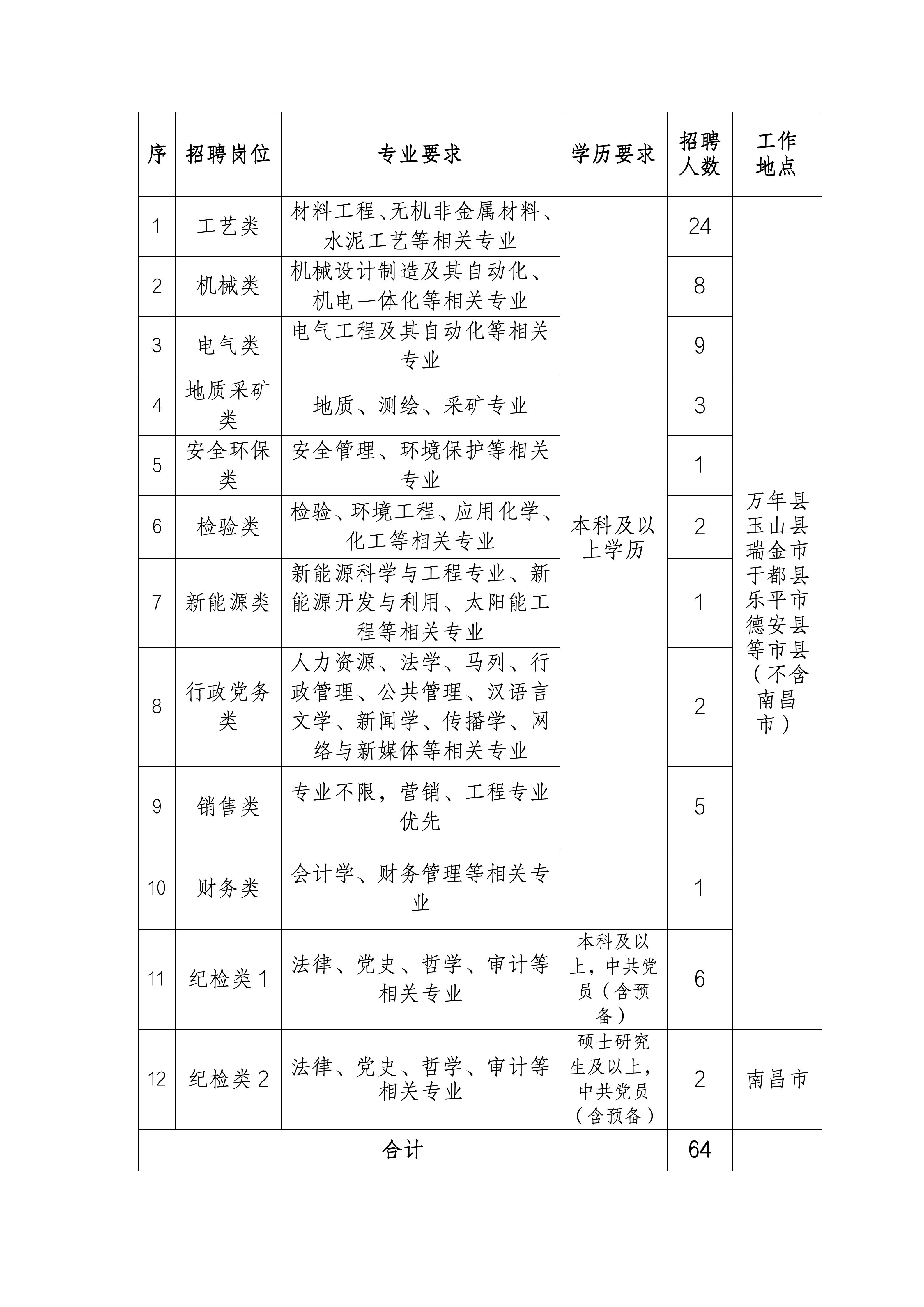 為滿足公司的生產(chǎn)經(jīng)營(yíng)需求,面向社會(huì)公開招聘,本次招聘崗位類別12個(gè),招聘人數(shù)共計(jì)64人,人員分配到江西省內(nèi)下屬各生產(chǎn)基地。