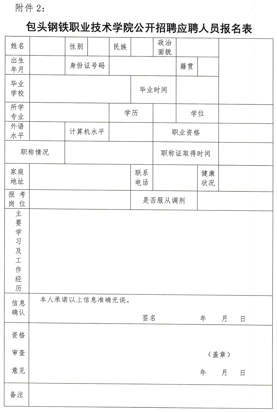 2. 包頭鋼鐵職業(yè)技術(shù)學院2022年對外公開招聘高校畢業(yè)生報名登記表