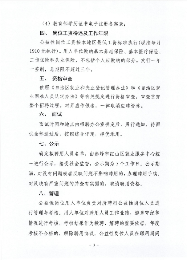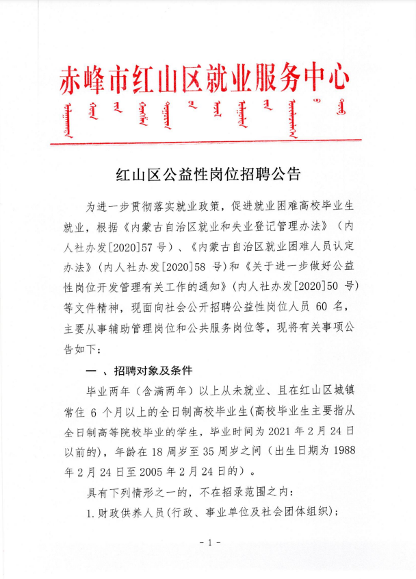 2023-02-28 14:38:43閱讀()赤峰公共招聘網(wǎng)為進(jìn)一步貫徹落實(shí)就業(yè)政策,促進(jìn)就業(yè)困難高校畢業(yè)生就業(yè),根據(jù)《內(nèi)蒙古自治區(qū)就業(yè)和失業(yè)登記管理辦法》(內(nèi)人社辦發(fā)[2020]57號(hào))、《內(nèi)蒙古自治區(qū)就業(yè)困難人員認(rèn)定辦法》(內(nèi)人社辦發(fā)[2020]58號(hào))和《關(guān)于進(jìn)一步做好公益性崗位開發(fā)管理有關(guān)工作的通知》(內(nèi)人社辦發(fā)[2020]50號(hào))等文件精神,現(xiàn)面向社會(huì)公開招聘公益性崗位人員60 名,主要從事輔助管理崗位和公共服務(wù)崗位等,現(xiàn)將有關(guān)事項(xiàng)公告如下:
