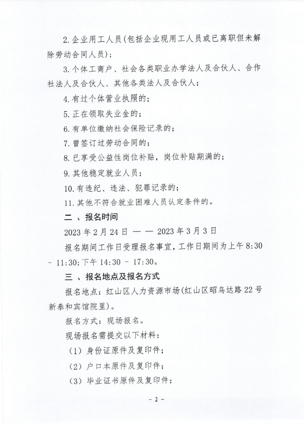 畢業(yè)兩年(含滿兩年)以上從未就業(yè)、且在紅山區(qū)城鎮(zhèn)常住6個(gè)月以上的全日制高校畢業(yè)生(高校畢業(yè)生主要指從全日制高等院校畢業(yè)的學(xué)生,畢業(yè)時(shí)間為2021年2月24日以前的),年齡在18周歲至35周歲之間(出生日期為1988年2月24日至2005年2月24日的)。