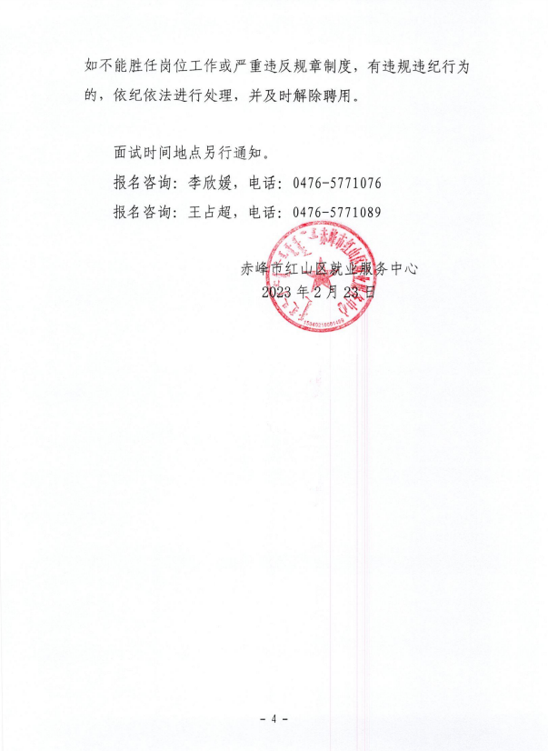 確定擬聘用人員名單,由赤峰市紅山區(qū)就業(yè)服務(wù)中心統(tǒng)一進(jìn)行公示,接受社會(huì)監(jiān)督,公示期為5個(gè)工作日。公示期滿,對沒有問題或者反映問題不影響聘用的,辦理聘用手續(xù)。對反映有嚴(yán)重問題的并查有實(shí)據(jù)的,取消聘用資格。