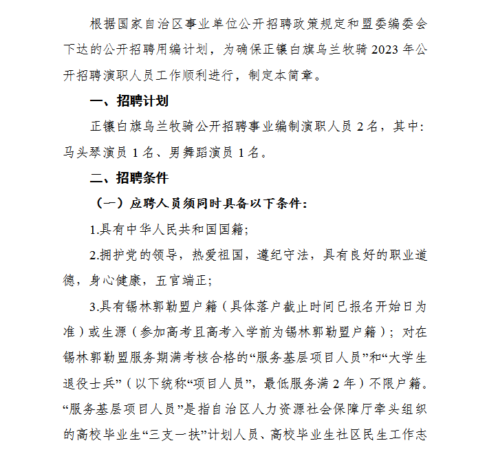 2023年錫林郭勒盟正鑲白旗烏蘭牧騎公開招聘演職人員簡章