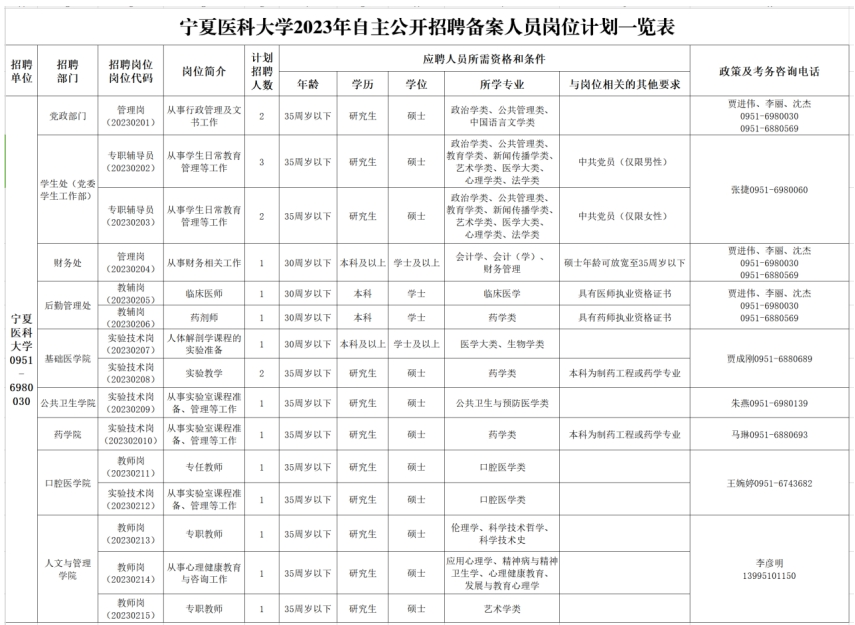 本次共招聘備案人員20人,詳見《寧夏醫(yī)科大學(xué)2023年自主公開招聘備案人員崗位一覽表》(附件)。
