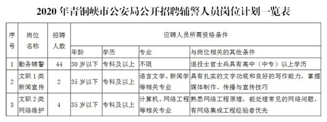 3.資格審核:報名時需提供戶口本、身份證、退伍證、學(xué)歷證原件及復(fù)印件各一張,近期1寸彩色照片4張,戶籍地派出所出具無違法犯罪記錄證明、銀行出具個人征信報告、報名現(xiàn)場填寫《青銅峽市公安局輔警報名表》。