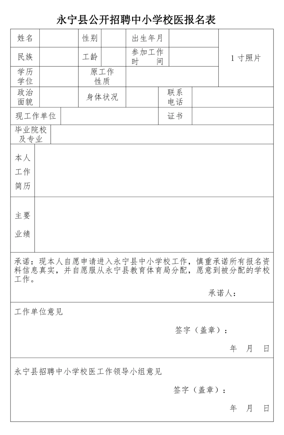 2、應聘者填寫《永寧縣教育體育局2020年自主公開招聘中小學校醫(yī)報名表》(附件),并在規(guī)定時間內(nèi)報名。