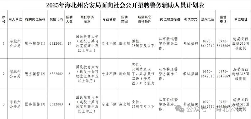 附:2025年海北州公安局面向社會公開招聘警務輔助人員計劃表