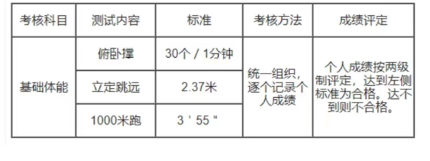 體能測試主要項(xiàng)目:1000米跑、仰臥起坐、立定跳遠(yuǎn),各項(xiàng)目測試標(biāo)準(zhǔn)如下: