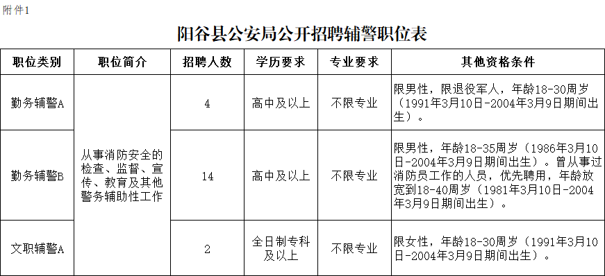 3、年滿(mǎn)18周歲,具體年齡要求詳見(jiàn)《陽(yáng)谷縣公安局公開(kāi)招聘輔警職位表》(附件1);