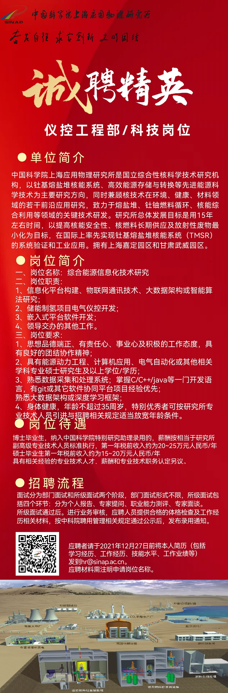 2021-12-23 23:00:03閱讀()中國(guó)科學(xué)院上海應(yīng)用物理研究所2021年上海應(yīng)物所儀控工程技術(shù)部崗位招聘啟事