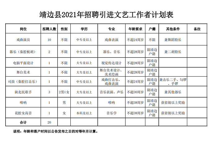 2021-10-14 20:24:00閱讀()靖邊縣人民政府為進一步加強我縣專業(yè)戲曲隊伍建設(shè),促進縣域文化藝術(shù)繁榮發(fā)展,提升公共文化服務(wù)水平,根據(jù)靖邊縣2021年第8次政府常務(wù)會議紀要精神,擬為我縣文化和旅游文物廣電局招聘引進文藝工作者20名?,F(xiàn)將相關(guān)事項公告如下。