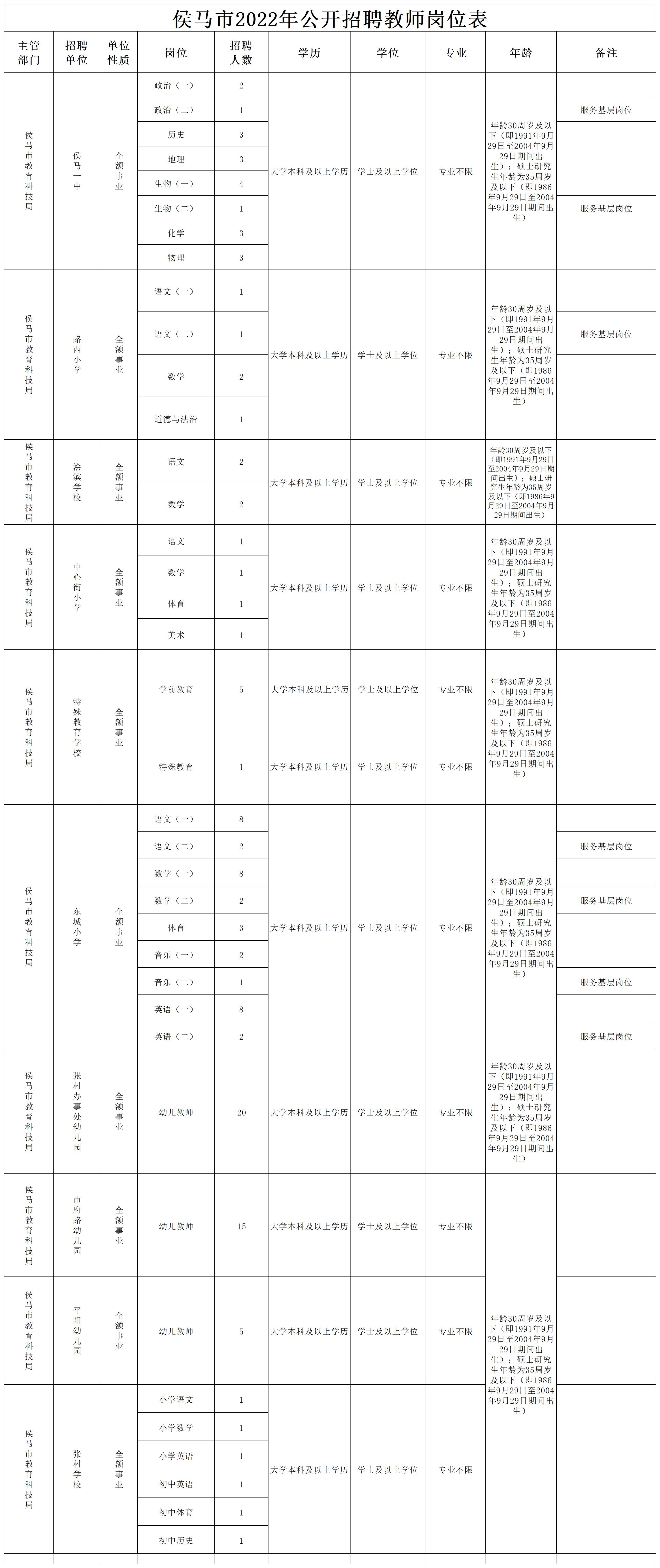 侯馬市2022年公開招聘中小學(xué)、幼兒園教師121名。各招聘崗位所需的具體條件以《侯馬市2022年公開招聘教師崗位表》(見附件,以下簡稱《崗位表》)的要求為準(zhǔn)。