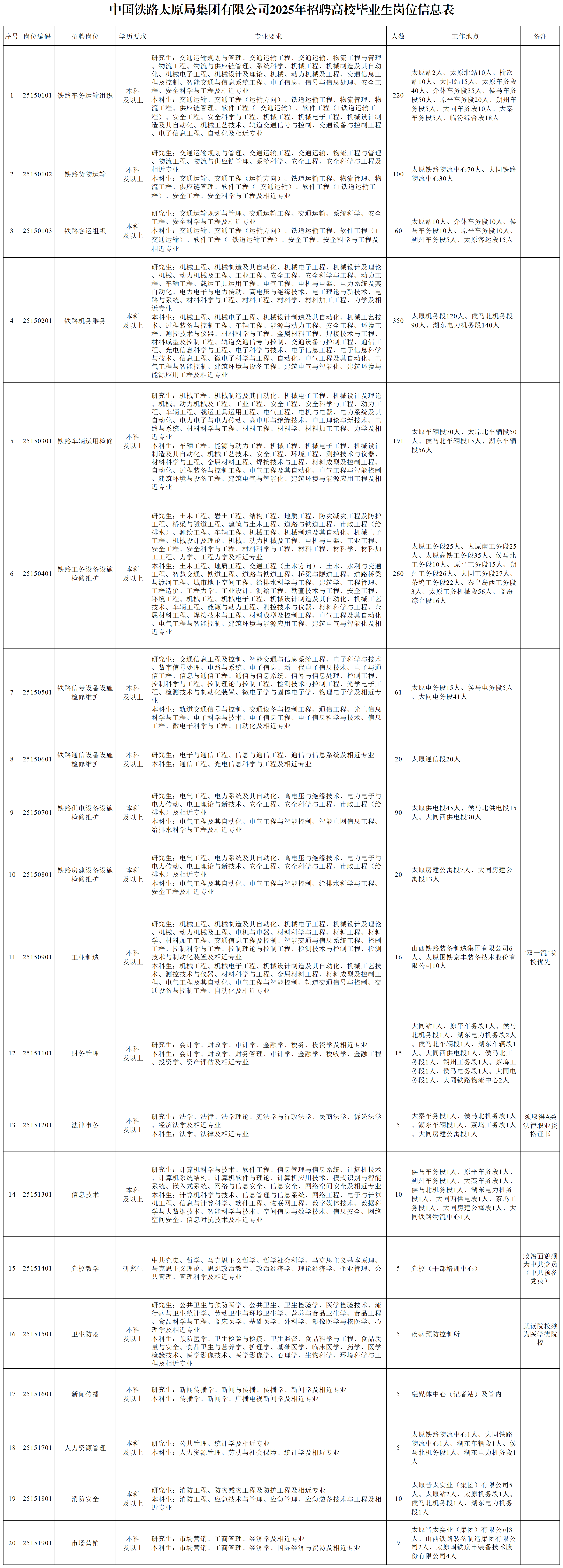 2024-11-02 14:37:50閱讀()中國鐵路太原局集團(tuán)有限公司根據(jù)企業(yè)發(fā)展需要,現(xiàn)將2025年普通高等院校研究生和全日制本科學(xué)歷畢業(yè)生招聘有關(guān)事項公告如下: