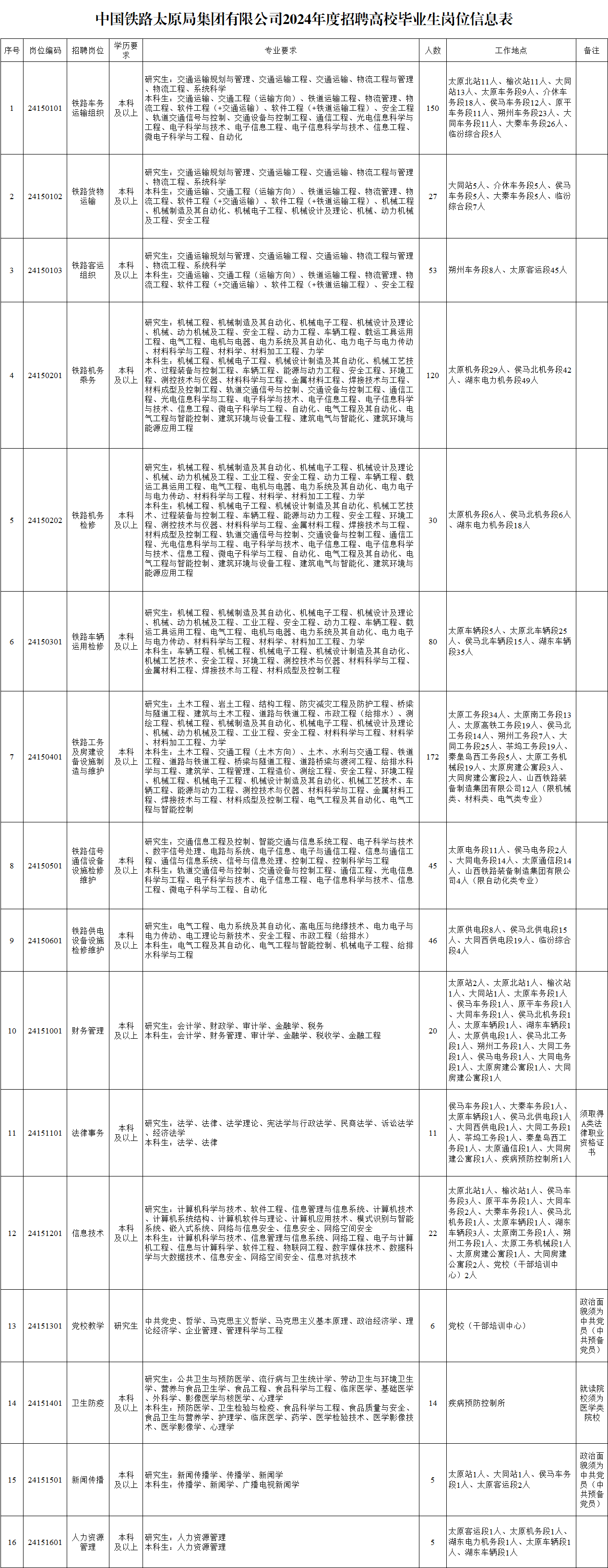 2023-11-28 21:23:08閱讀()中國(guó)鐵路太原局集團(tuán)有限公司根據(jù)企業(yè)發(fā)展需要,現(xiàn)將2024年普通高等院校研究生和全日制本科學(xué)歷畢業(yè)生招聘有關(guān)事項(xiàng)公告如下: