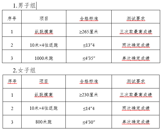 體能測評按照規(guī)定的標準和程序進行,進入體測人員按照與各崗位(代碼)計劃招聘人數(shù)3 :l的比例,根據(jù)筆試成績從高到低依次確定。達不到比例的,按照實際人數(shù)進行測評。體能測評不合格的,不能進入面試;未按要求參加的,視為放棄資格。體能測評后,按照與各崗位(代碼)計劃招聘人數(shù)2 :l的比例確定進入面試人員。體能測評采取單項淘汰方式進行,凡一項不達標的視為體能測試不合格。體能測評成績將于測試當日進行公布,并由考生簽字確認。