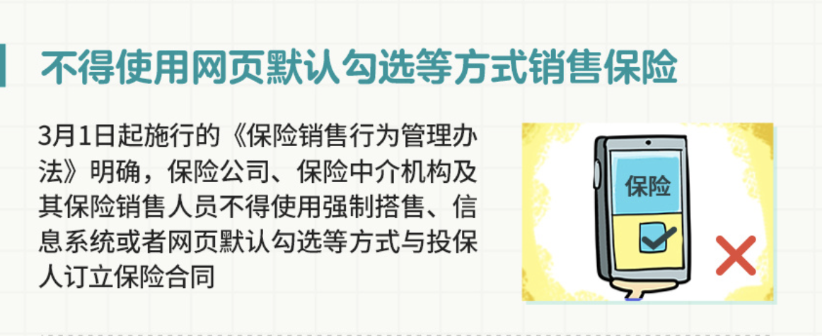 3月1日起施行的《保險銷售行為管理辦法》明確,保險公司、保險中介機構(gòu)及保險其保險銷售人員不得使用強制搭售、信息系統(tǒng)或者網(wǎng)頁默認勾選等方式與投保人訂立保險合同。